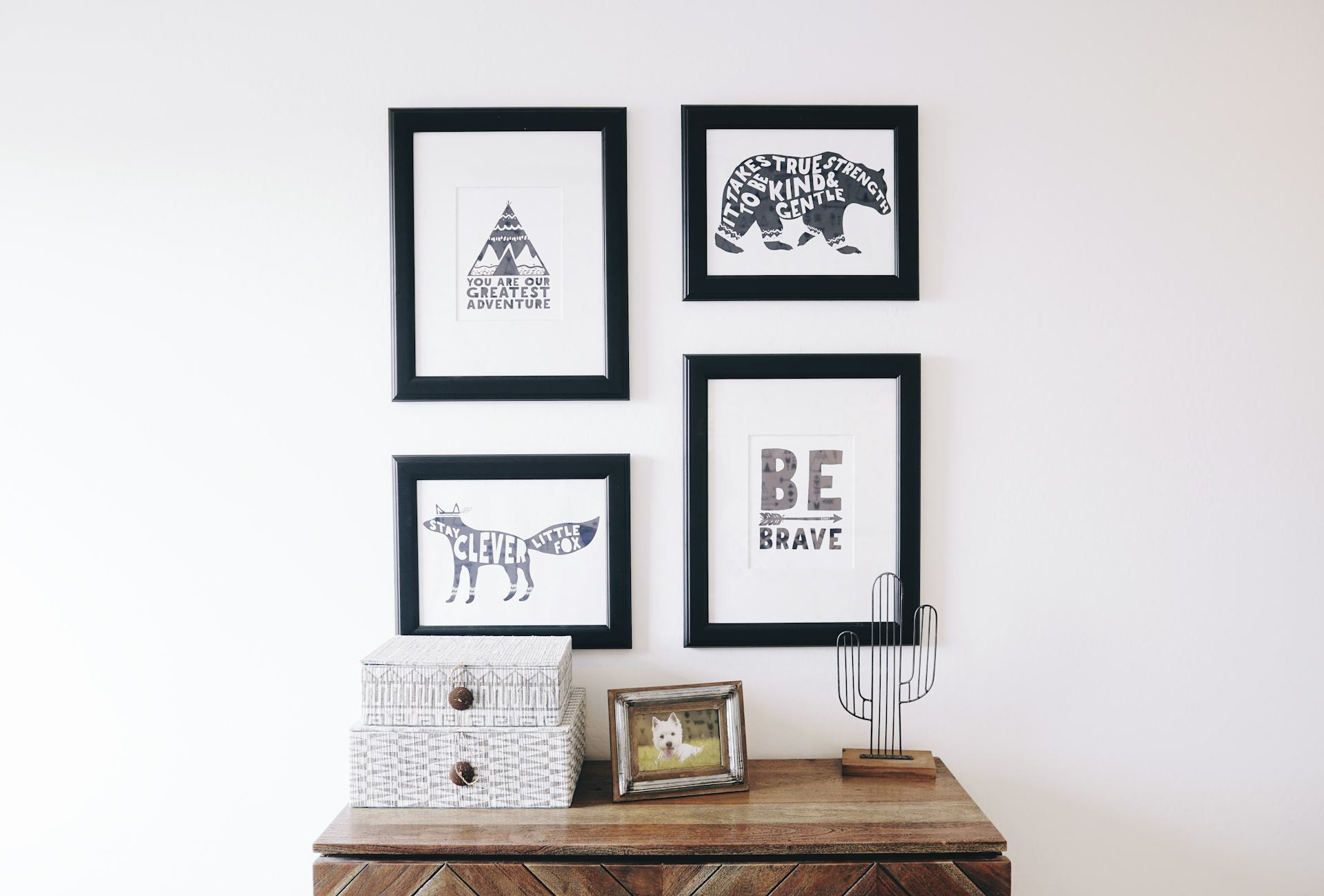 Wenn du keine Löcher bohren möchtest, kannst du kleinere Stücke auch auf Bilderleisten oder schmalen Regalen platzieren. So lassen sie sich leicht umstellen und neu kombinieren.
